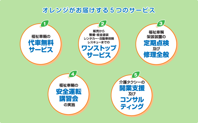以上の決意のもと、福祉車輌の専門店として次に掲げる5つのサービスをご提供します。